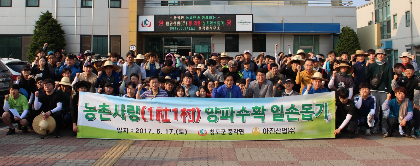 아진산업(주)(대표이사 서중호) 임·직원 200여 명은 지난 17일 본격적인 농번기를 맞아 일손이 부족한 풍각면의 고령자와 부녀자 농가를 찾아 마늘, 양파수확에 구슬땀을 흘렸다. 이날 일손돕기 후 양파 300망을 구입해 갔다.
